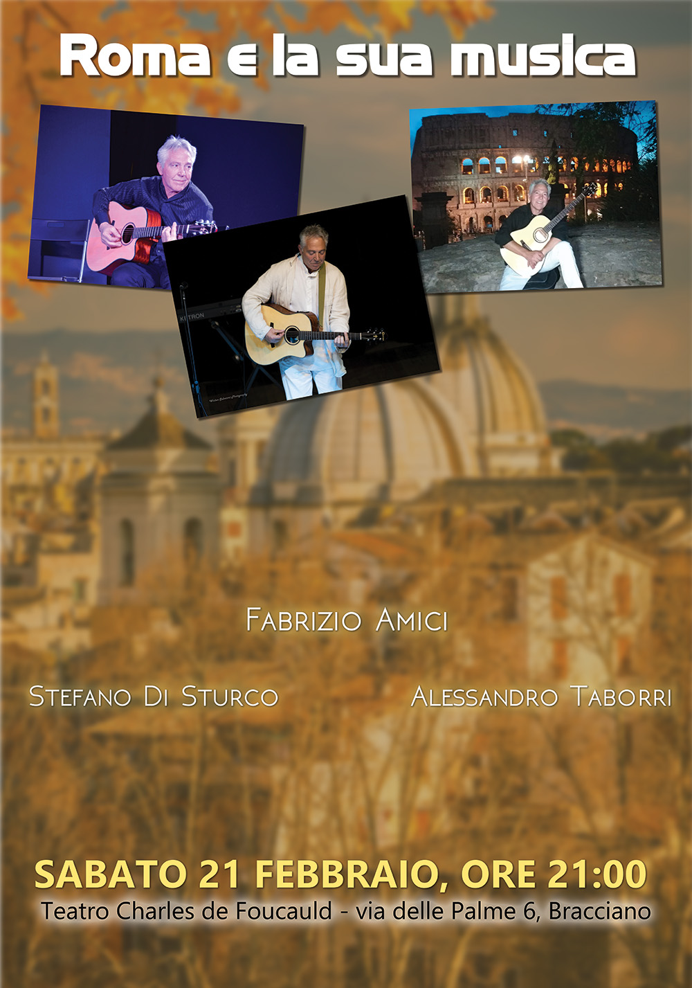 Fabrizio Amici, figlio del noto cantante romano Alvaro Amici, torna sul palcoscenico accompagnato alla fisarmonica da Stefano Di Sturco e alle percussioni da Alessandro Taborri per deliziarci con i più famosi stornelli della bella Roma e le canzoni che hanno e continuano ancora oggi a segnare più generazioni.