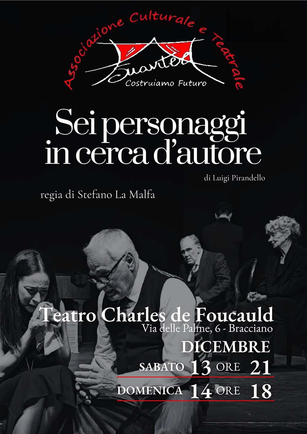 La trama è nota: mentre una compagnia teatrale sta provando uno spettacolo, in sala irrompono “Sei personaggi”, il Padre, la Madre, il Figlio, la Figlia, il Giovinetto e la Bambina e chiedono di essere ascoltati: sono nati dalla fantasia di un autore, che però li ha presto abbandonati, impedendo di pronunciare in scena le loro battute e di vivere la loro “vita”.