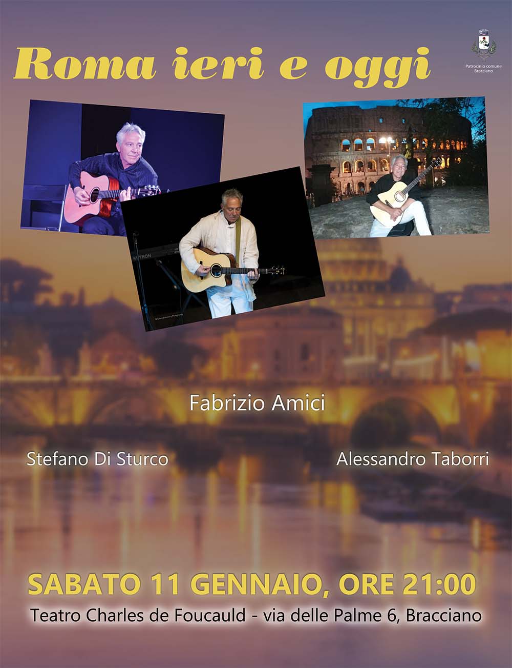 Fabrizio Amici, figlio del noto cantante romano Alvaro Amici, torna sul palcoscenico accompagnato alla fisarmonica da Stefano Di Sturco e alle percussioni da Alessandro Taborri per deliziarci con i più famosi stornelli della bella Roma e le canzoni che hanno e continuano ancora oggi a segnare più generazioni.