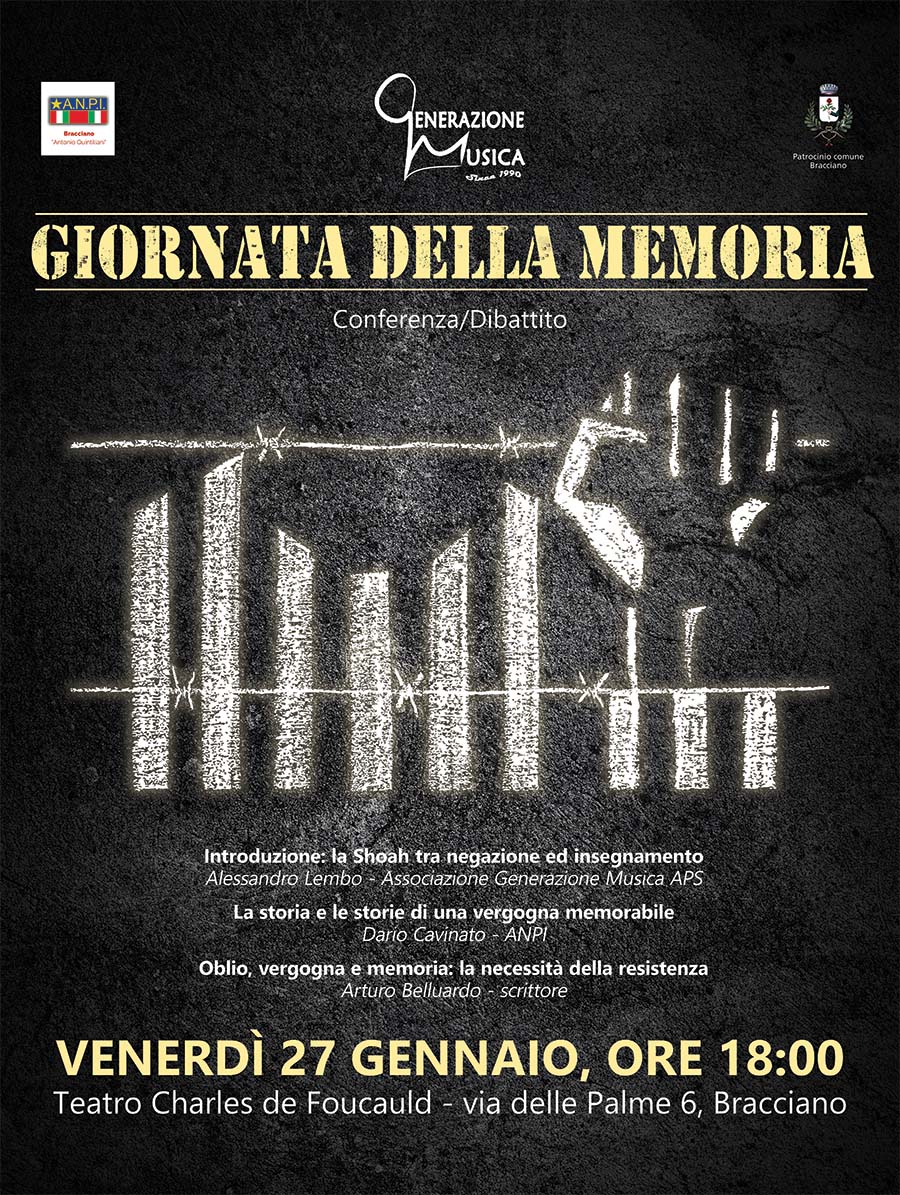 Generazione Musica presenta: “Giornata della Memoria”- Conferenza-Dibattito con la partecipazione di Dario Cavinato, storico e presidente dell’ANPI Bracciano, Arturo Belluardo, scrittore. Introduzione di Alessandro Lembo, associazione Generazione Musica.