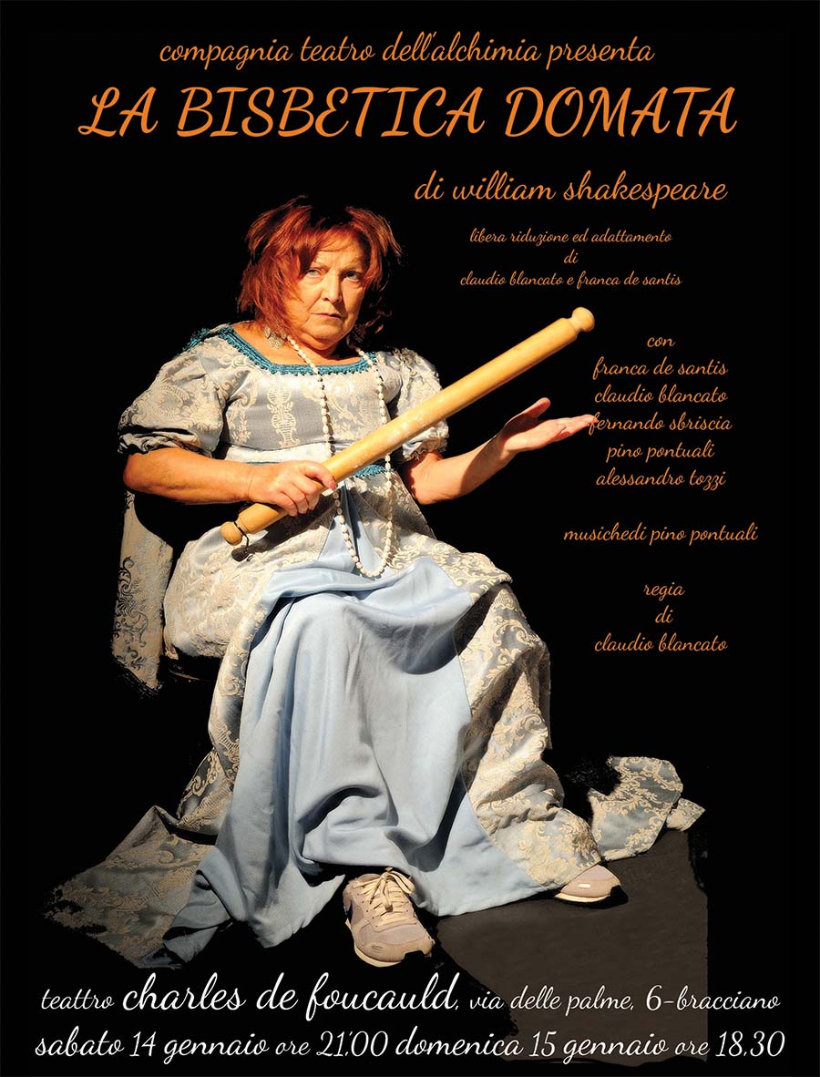 Una bisbetica perfetta, Franca De Santis, sgraziata al punto giusto per entrare nel personaggio, interpretato da una coatta della borgata Finocchio di Roma, “corteggiata” da un povero Petruccio, interpretato dal regista stesso Claudio Blancato, che nella narrazione è anche il regista delle prove.